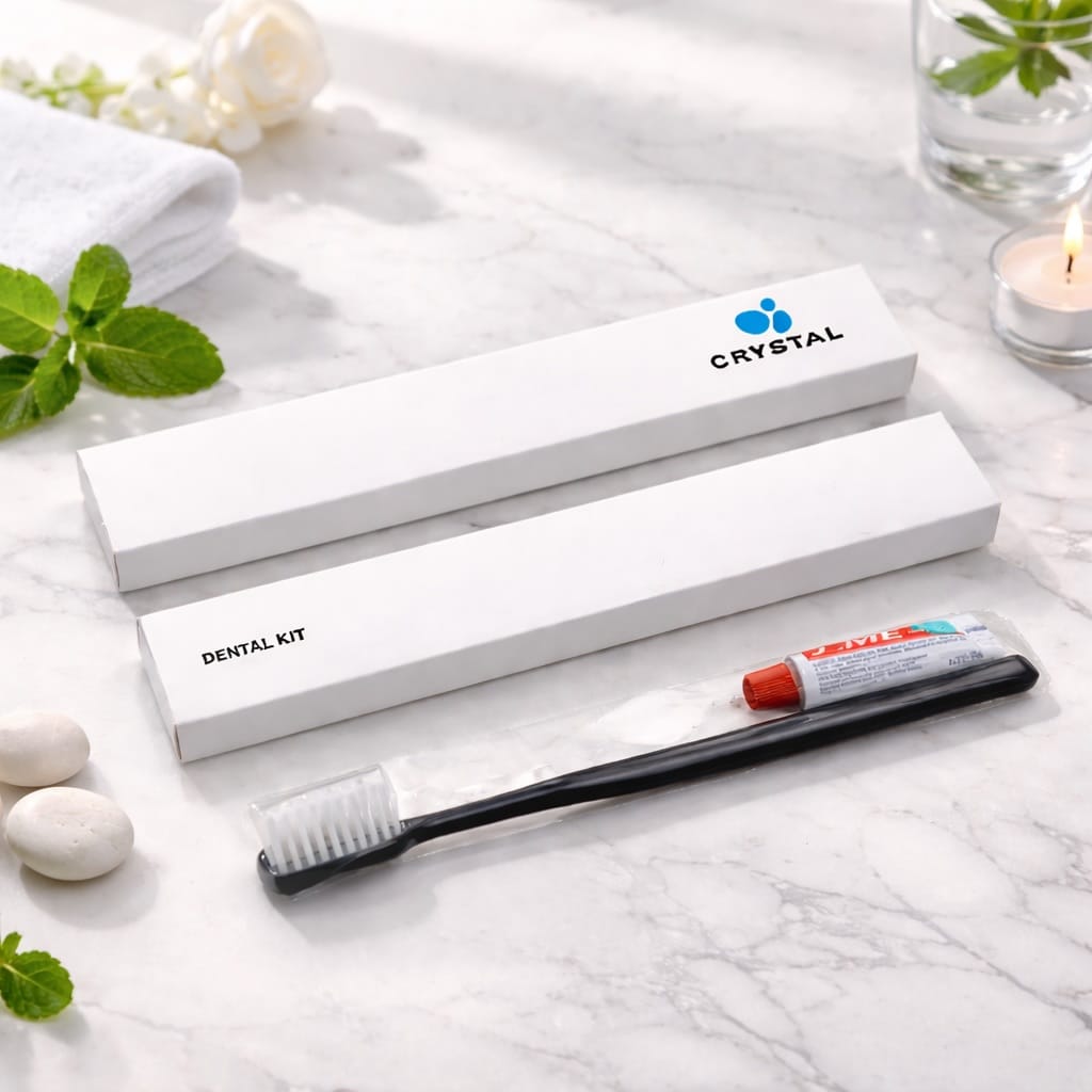Komplet dental praktik dhe elegant, i përshtatshëm për Hotele dhe Airbnb, që u ofron mysafirëve një ndjesi pastërtie dhe kujdesi që në momentin e parë. Përfshin furçë dhëmbësh dhe pastë dhëmbësh, ideale për një higjienë orale të përditshme dhe të rehatshme – një detaj i vogël që rrit ndjeshëm cilësinë e përvojës së qëndrimit.